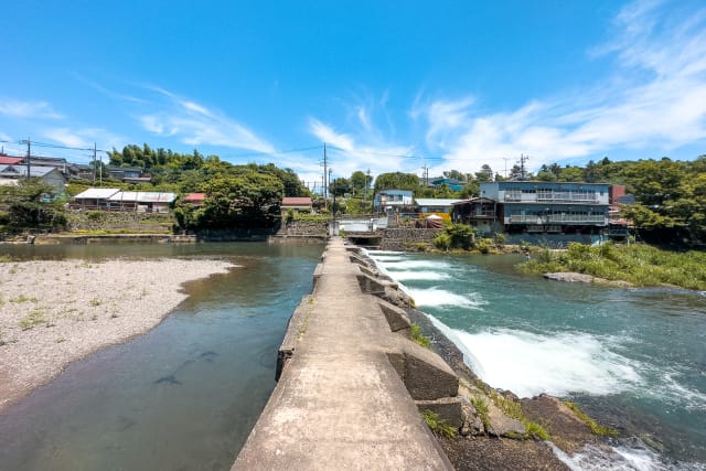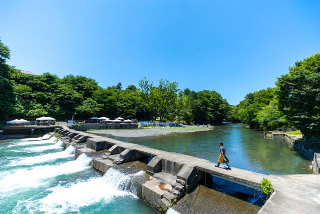 堰を流れる豊富な水流は見ているだけで癒やされます。快晴の日は白い飛沫がひときわ涼し気で気持ちの良い眺めです。堰を渡ると対岸にはカフェやバーベキューなどの営業もあります。