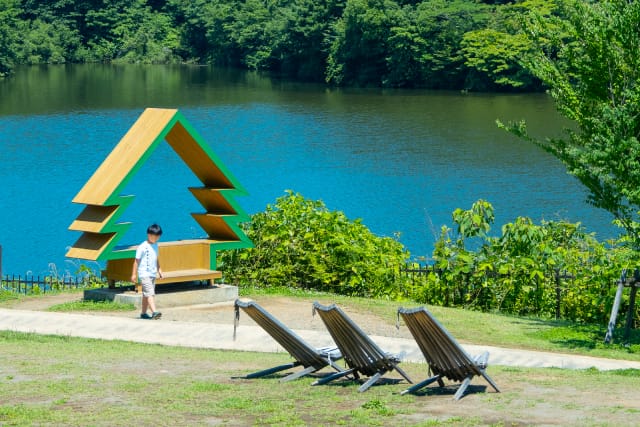 湖畔の芝生エリアにはフリーのデッキチェアやベンチが。お昼寝、読書や、ただ何もせず湖畔を流れる風を味わう...思い思いの過ごし方。