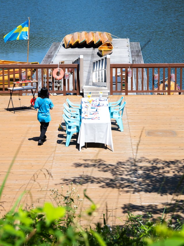 湖で体験するカヤックは、流れもゆるやかで安全に楽しめるのがポイント。木製のカヤックが北欧気分を盛り上げます。