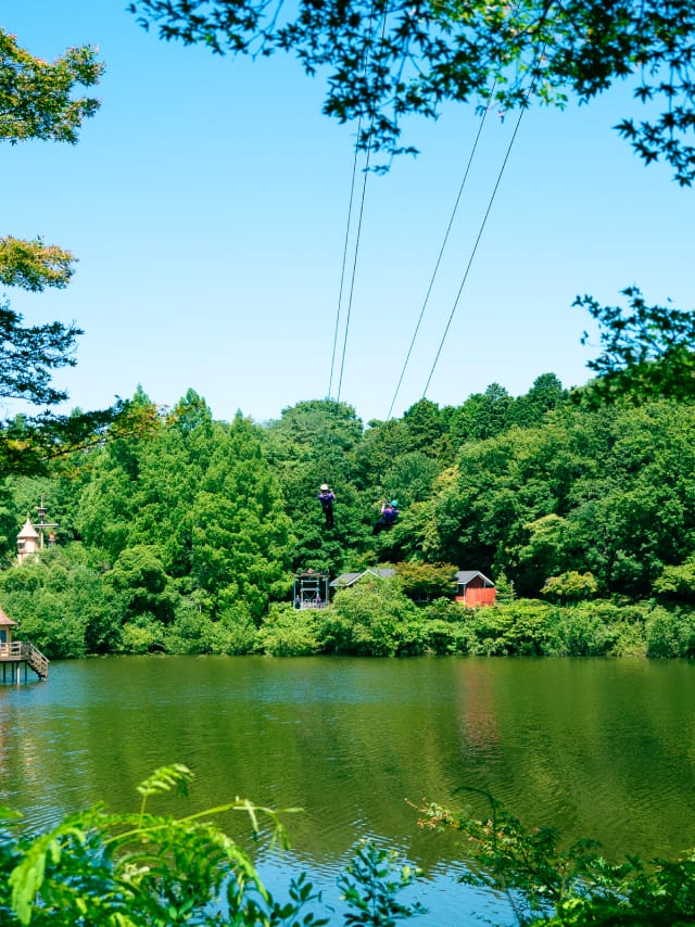 飛行おにのジップラインアドベンチャー。ムーミンの原作小説『たのしいムーミン一家』に登場する、不思議な力を持った魔法つかい“飛行おに”をモチーフにしたジップライン。大自然の緑に囲まれた湖上を疾走る気分は最高です!
