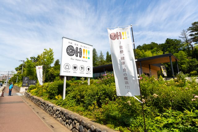 ユニークな円筒形の外観の建物が目印。ぬか漬けから発見された植物由来の「ピーネ乳酸菌」と糀、野菜をたっぷり使ったメニュー・商品を提供してくれるOH!!が運営するカフェです。お食事メニューやスイーツは室内カフェスペースだけではなく、テイクアウトでも楽めます。おいしくてからだに嬉しい、こだわりのオリジナル商品も購入できますのでぜひのぞいてみてくださいね。