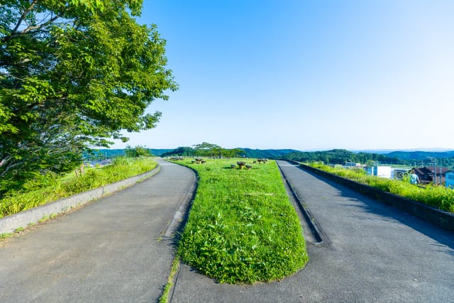 龍崖山公園を後にして、真新しい戸建てが並ぶ新興住宅街のある坂道を抜けると、広い空が見渡せるこの展望公園にたどり着きます。