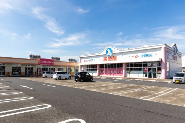 ベビー・こども用品の総合ストア西松屋と人気の100均ショップ・ダイソーが並ぶエリア。