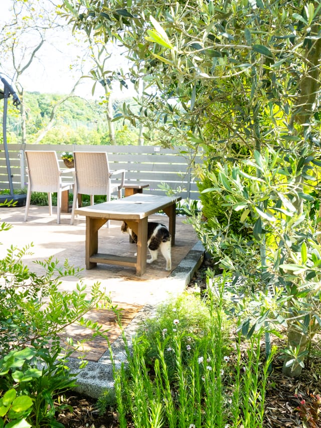 小径の植え込みの向こうには可愛いテーブルと椅子が置かれており、天気のいい日はランチもできます。運が良ければ猫ちゃんにも会えるかも。