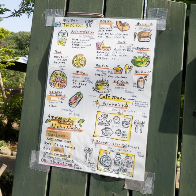 ショップ入り口にはオーナーさんが手書きしたメニュー紹介が。そえてあるイラストもカラフルでとっても可愛いタッチです。