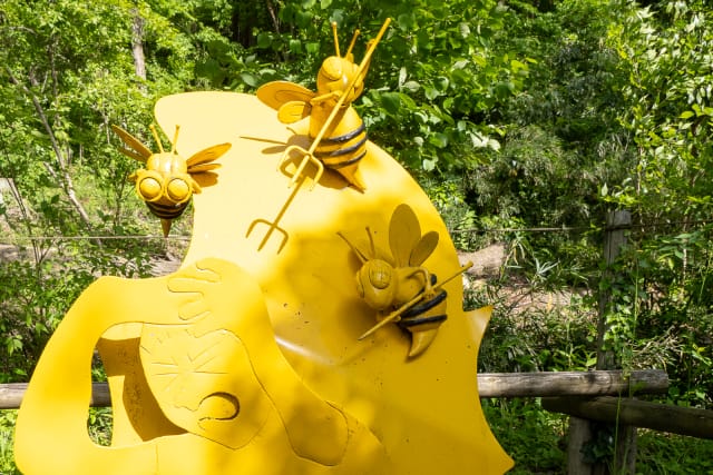 このスズメバチをはじめ、園内に複数設置されている鉄製のオブジェ。実はこれ、注意喚起のために置かれたものなのです。自然の中には危険な虫や地形などもあるため、このようなオブジェで視覚的に教えてくれるわけです。