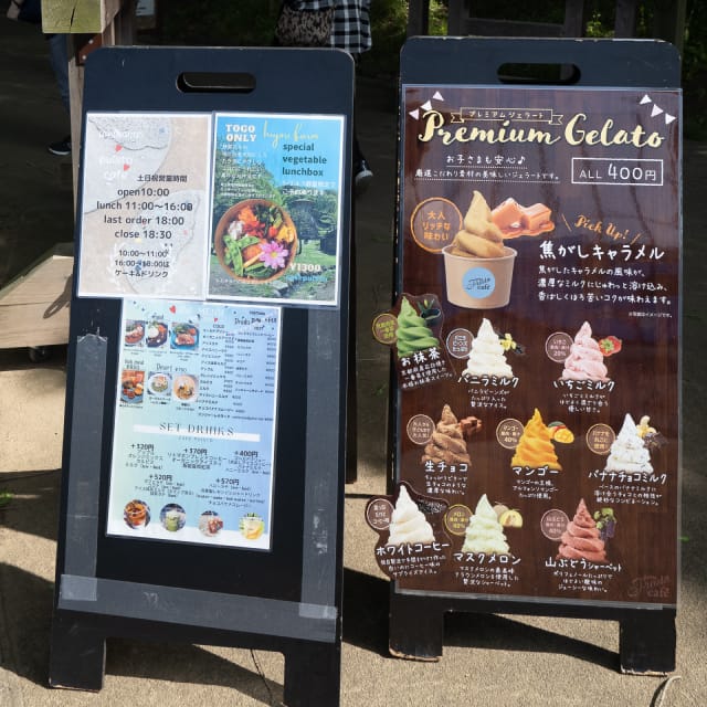 いかがでしたか? 日本の公園とは思えない丁寧な造作の建物やレイアウト。思わず元加治に住みたくなる魅力に溢れています。入口の案内板では販売中のアイスクリームのフレーバーや、イベント、カフェメニューのお知らせもありますので来園時にはぜひチェックしてみてください。