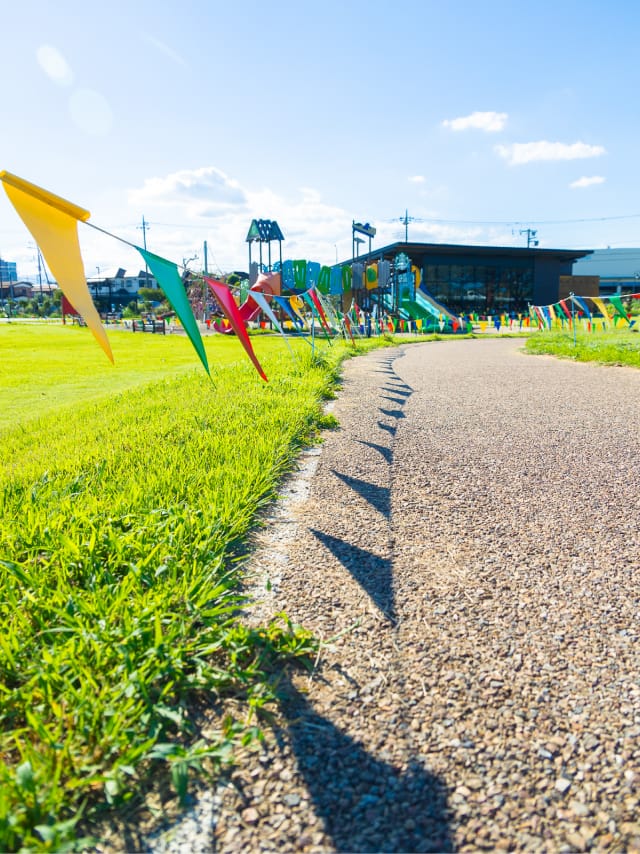 入間川沿いに官民連携で造られた「ニコニコテラス」。広い芝生のスペースに子供向けの遊具やカフェ、イベントスペースを設けた狭山市の新しい賑わいスポットです。ペット連れもOKです。