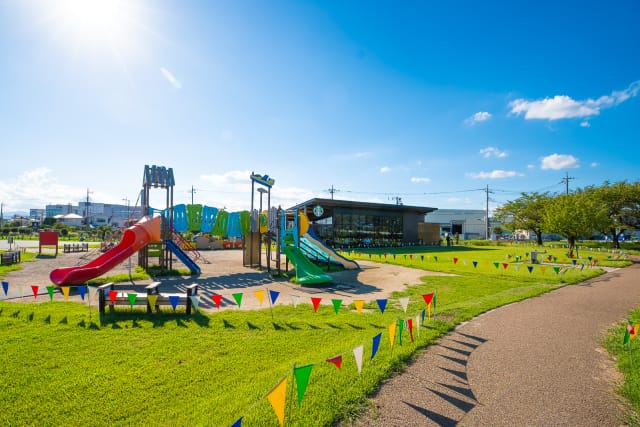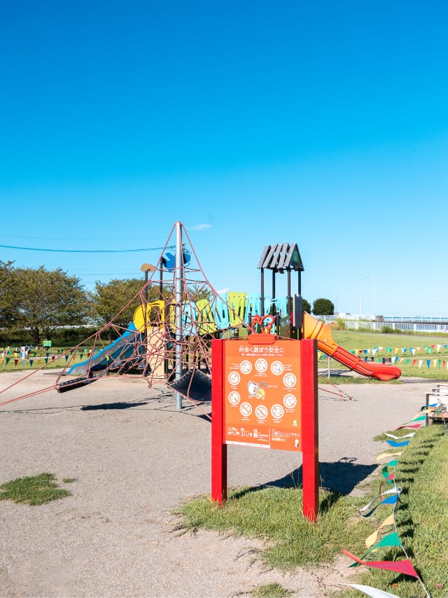 遊具は1歳から3歳の乳幼児向け遊具と、入間川の流れをイメージした、ワイドな滑り台やクライミングネットの大型複合遊具があります。ベビーカーポートもありますよ。