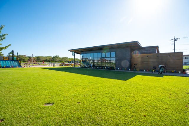 営業時間:7:00〜22:00 定休日:不定休。芝生広場に面した客席からはお子さんが遊んでる姿を眺めることもできます。