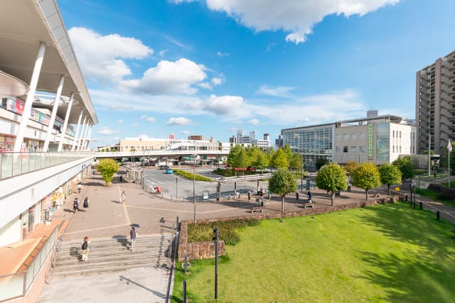 西口市民広場へは西口からペデストリアンデッキで。駅のロータリー全体を一望できる眺めもおすすめです。