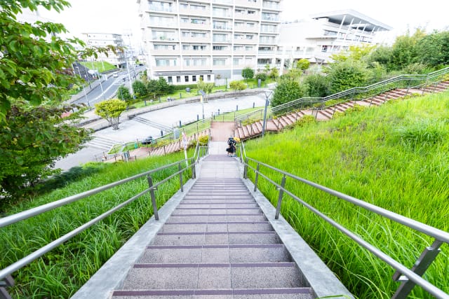 入間川小学校跡地公園は高台にあるので、市民広場からはこの階段で。