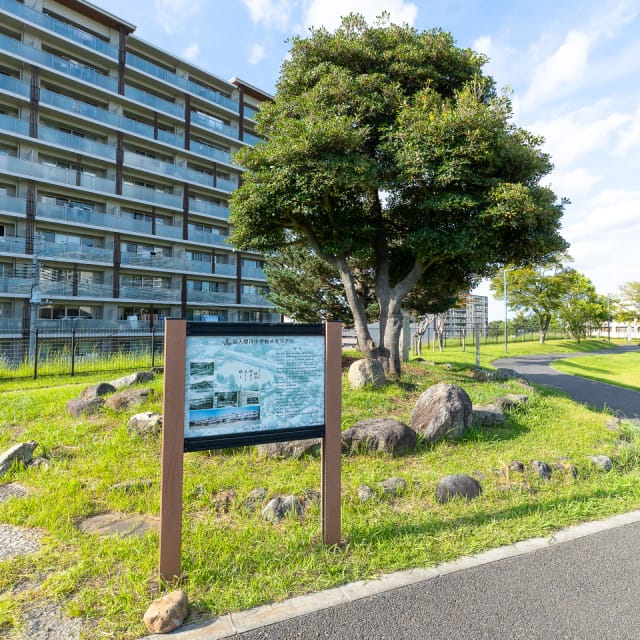 地区内から採取した土を10 センチ角のタイルにして、市民 の方が好きな絵柄や模様、手形 などをつけたりして約5000 枚の「思い出タイル」を焼きあ げ、市民広場の随所に貼られて います。