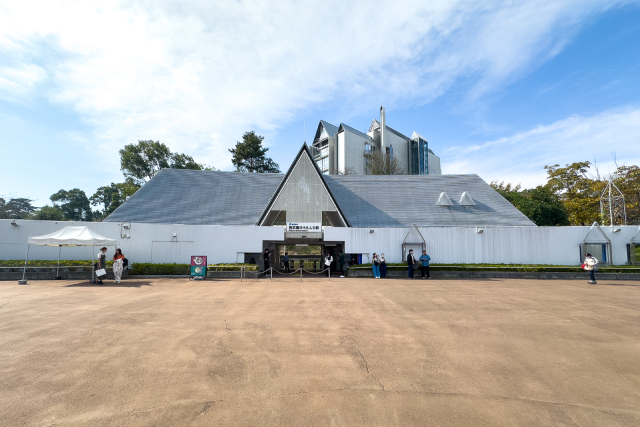 駅前に出てすぐ、園内を見下ろす小高い丘に立つ「夕陽館」。昭和時代の映画館のようなレトロなデザインの建物の中には、最先端のアトラクション体験が待っている!