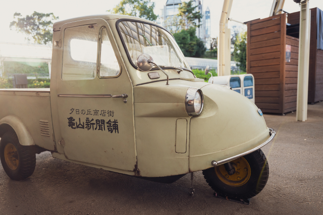 昭和40年代くらいまでは走るのを見かけていた三輪の車。小さなボディがかわいい。