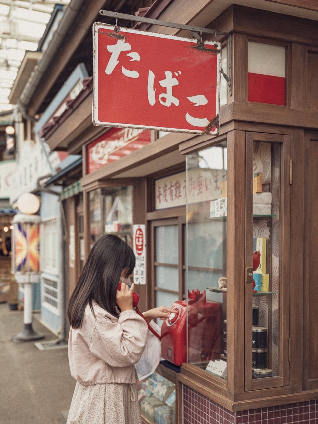 たばこ屋さんとセットで置いてあった赤電話。ダイヤル型のかけ方分かるかな?