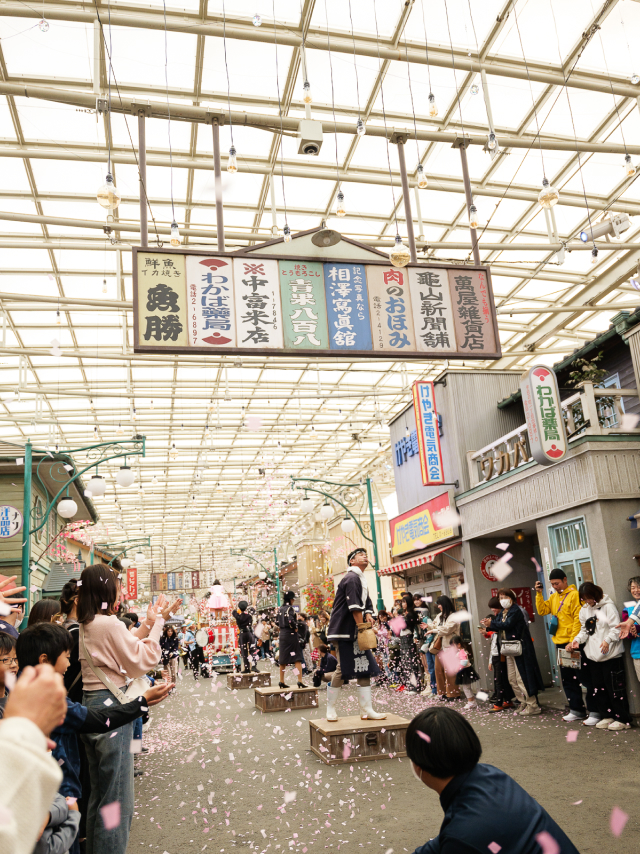 商店街の通りをつかって定期的に行われるお祭りパレード。商店街の仲間たちと、元気いっぱいの踊りと掛け声でみんなでブギウギ楽しみましょう!