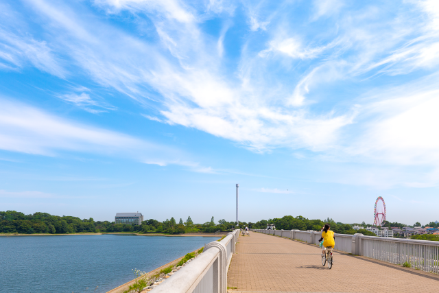 堤堰に整備されたどこまでも一直線のサイクリングロードは、湖面を撫でる爽やかな風を感じながらリフレッシュできる人気の散策コースです。