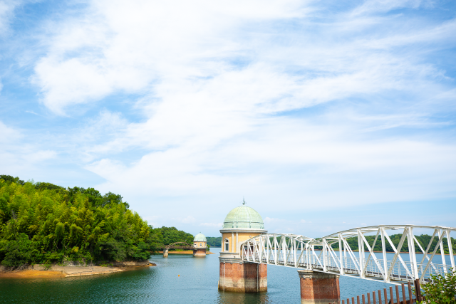 「取水塔」とはダムなどの水面・水深が安定している水源から、原水をくみ上げるための施設です。村山下第一取水塔は大正14(1925)年竣工、奥にある第二取水塔は昭和48(1973)年の建物で、いずれも美しい建築様式で立てられた歴史価値の高い建造物です。新東京百景と、東やまと20景に選ばれています。