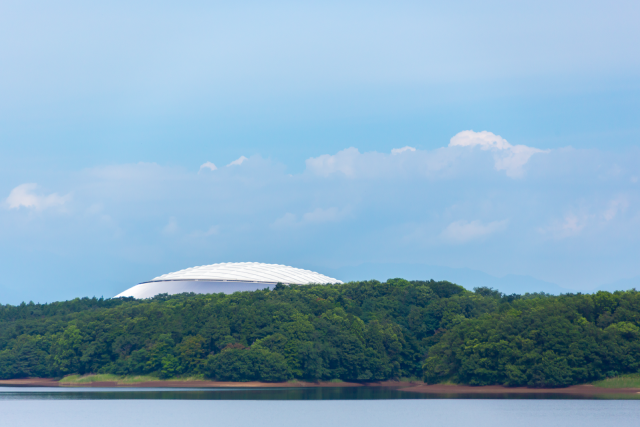 埼玉西武ライオンズの本拠地。ドームの巨大な白い天幕が空の青と爽やかな対比を見せます。