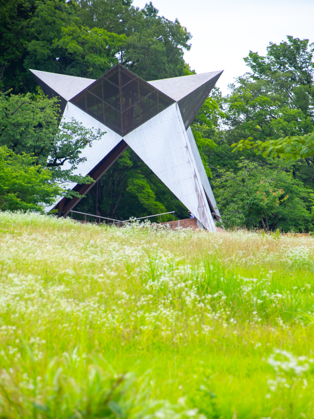 自然の中に建つひと際目を引く多面体のオブジェのようなこの建物は、トイレと休憩所になっています。